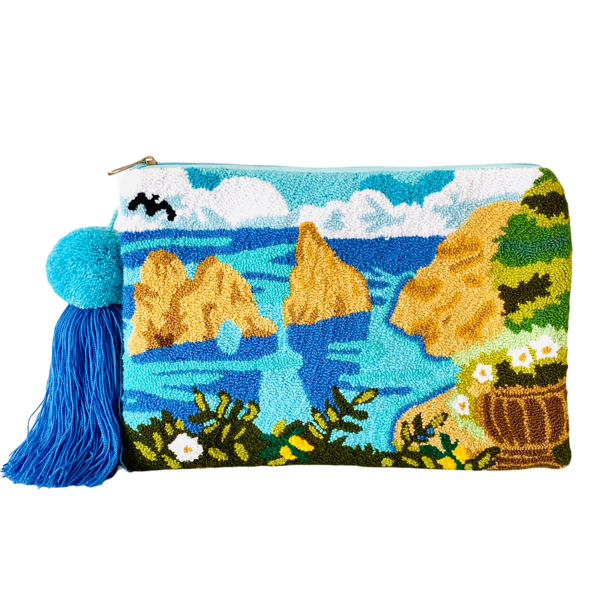 Capri Rocks Clutch is a true textile work of art. Capri Blue and Mediterranean colours are handwoven on a loom to recreate this fabulous intricate design representing the world famous Capri Rocks called I Faraglioni. The clutch is double sided. By M. Design has selected the best female artisans for this project. We have used an ancient crochet tapestry technique passed down the generations from mother to daughter. Each bag is completely unique. Bring it on holidays with you — pack them flat or fold them. They are brilliant to save space! We Love the big joyous Pom Pom with the Tassel