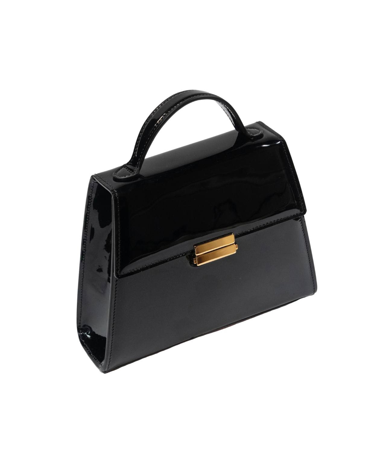 A Tribute to the late Queen Elizabeth II and her iconic colours. A Limited Edition of H.M. classic shaped bag in a Bon Bon size. Everything fits. You can carry it as a handbag or over the shoulder with its detachable and adjustable strap. Here in a timeless iconic black patent leather with gold clasp.
