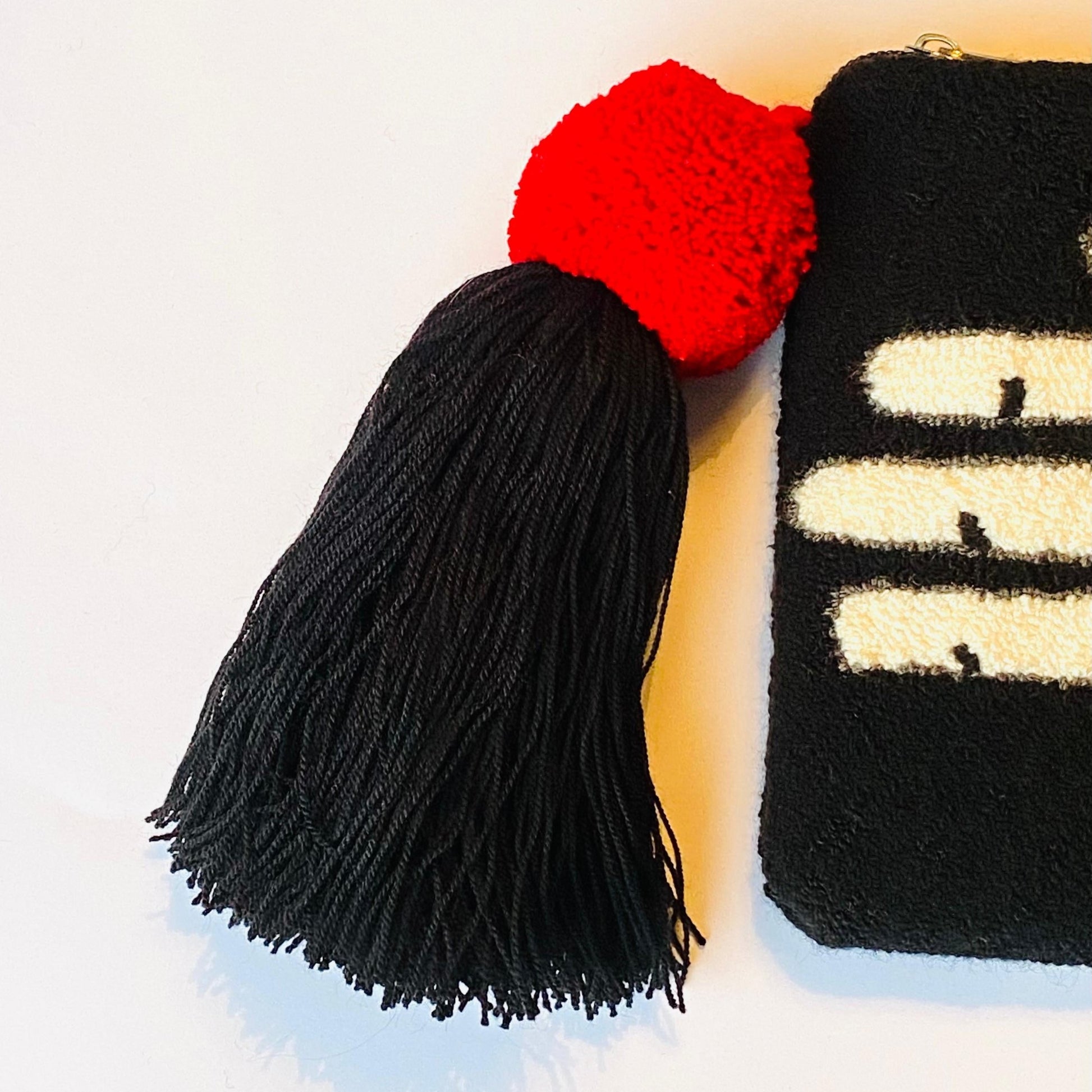 Lunga Vita Clutch is a true textile work of art. The vintage Fornasetti inspired design is handwoven on a loom to recreate this fabulous intricate “Mano” hand image. The Life Line and charms symbolise good luck. The clutch is double sided. By M. Design has selected the best female artisans for this project. We have used an ancient crochet tapestry technique passed down the generations from mother to daughter. Each bag is completely unique. Bring it on holidays with you — pack them flat or fold them. They are brilliant to save space! We Love the big joyous red Pom Pom with the blac5 Tassel