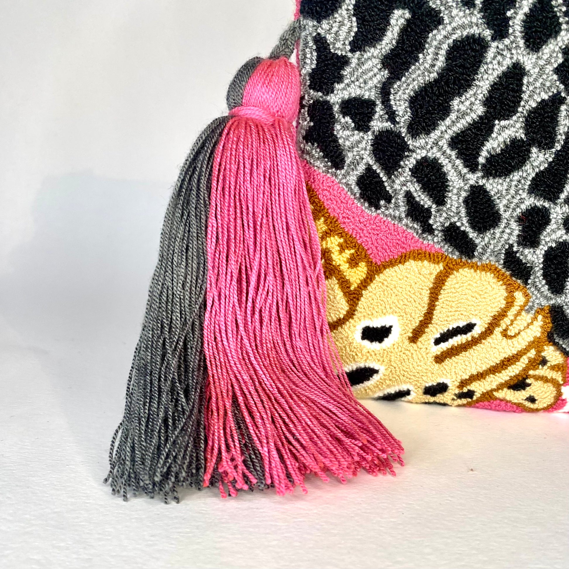 Our panther clutch is a textile work of art. The Iconic feline is handwoven on a loom. The clutch is double sided. By M. Design has selected the best female artisans for this project. We have used an ancient crochet tapestry technique passed down the generations from mother to daughter. Each bag is completely unique. Bring it on holidays with you — pack them flat or fold them. They are brilliant to save space! We Love the big tassel. Wash it by hand in cold water.