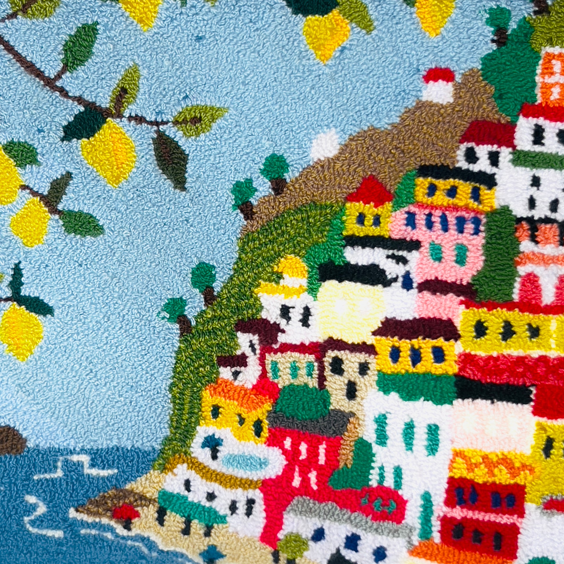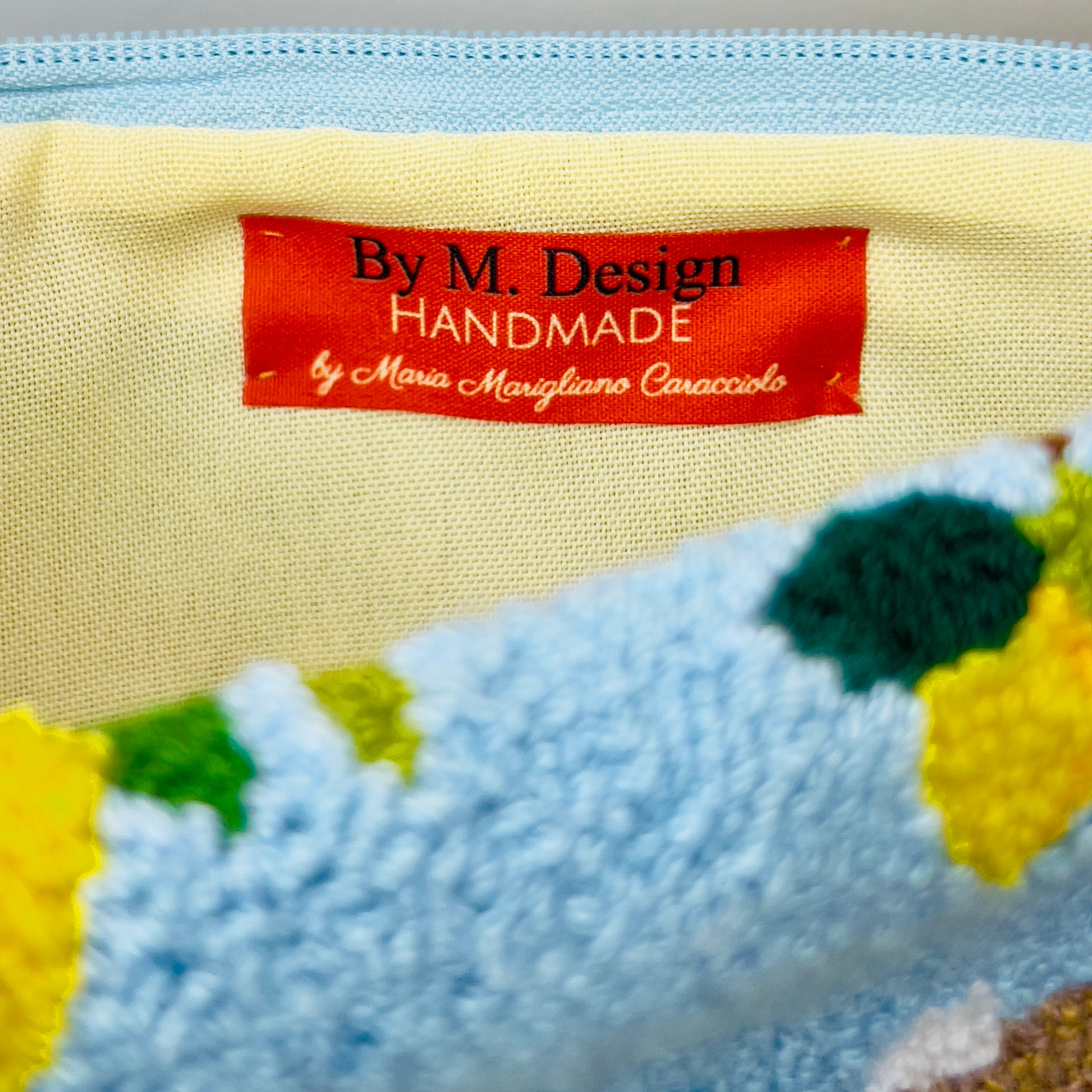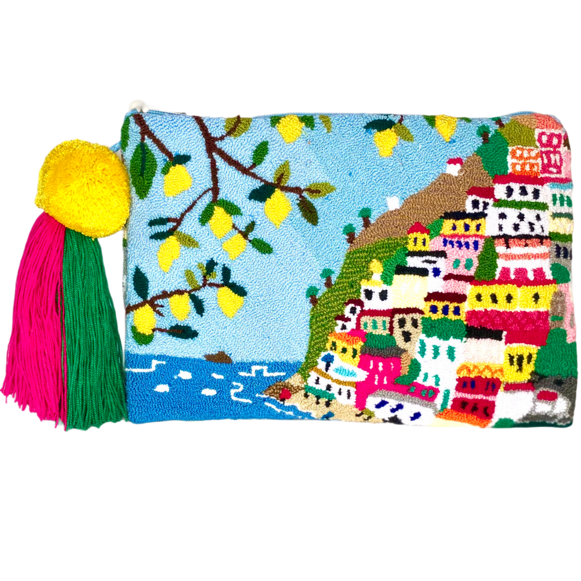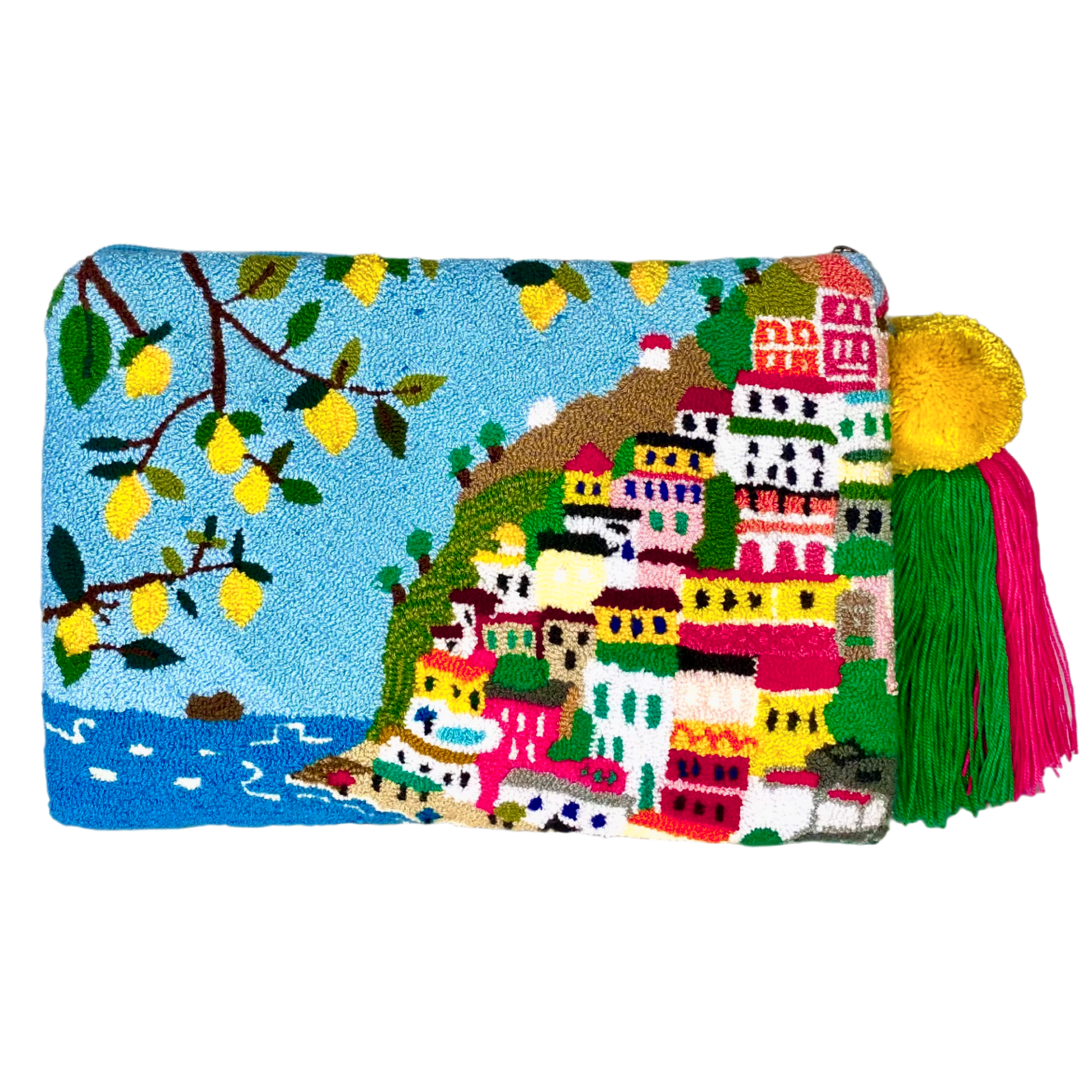 By M. POSITANO Clutch is a true textile work of art. The unique Positano landscape and lemons are hand woven on a loom to recreate this fabulous intricate design on both sides. Maria Marigliano Caracciolo has selected the best female artisans for this project. We have used an ancient crochet tapestry technique passed down the generations. Each bag is completely unique. Bring it on holidays with you! Pack it flat or fold it, they are brilliant to save space! We Love the big yellow lemon Pom Pom with the Tassel. Wash it by hand in cold water.