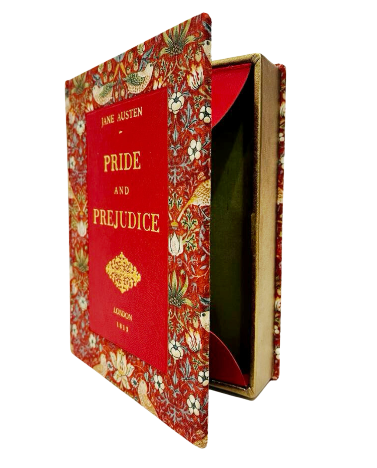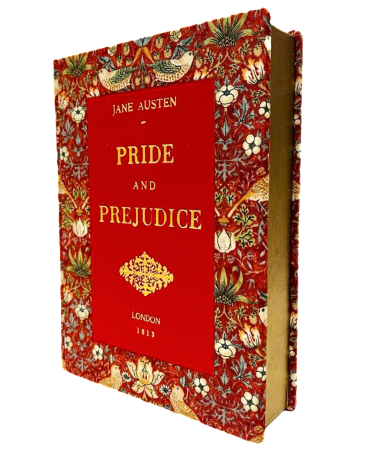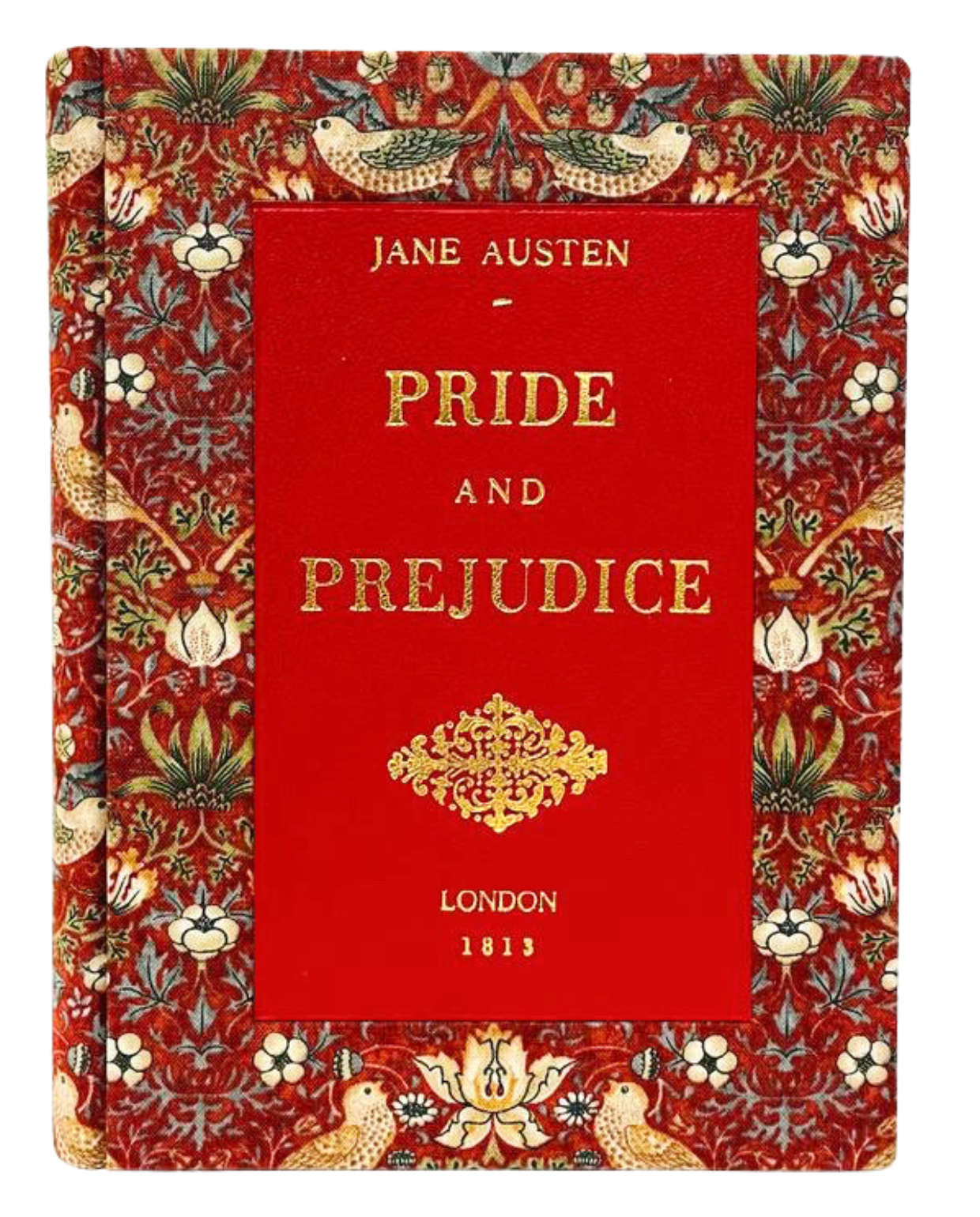 A Pride and prejudice edition bound with the iconic William Morris fabric and a traditional vibrant red leather. The beautiful print featuring birds stealing strawberries designed in 1883 is the perfect beautiful for the world famous English novel.