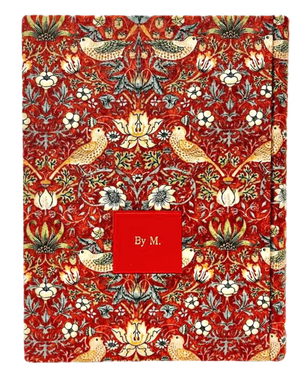 - The clutch is made of 100 % cotton fabric designed by William Morris and red leather. The page sides are in gold leather.