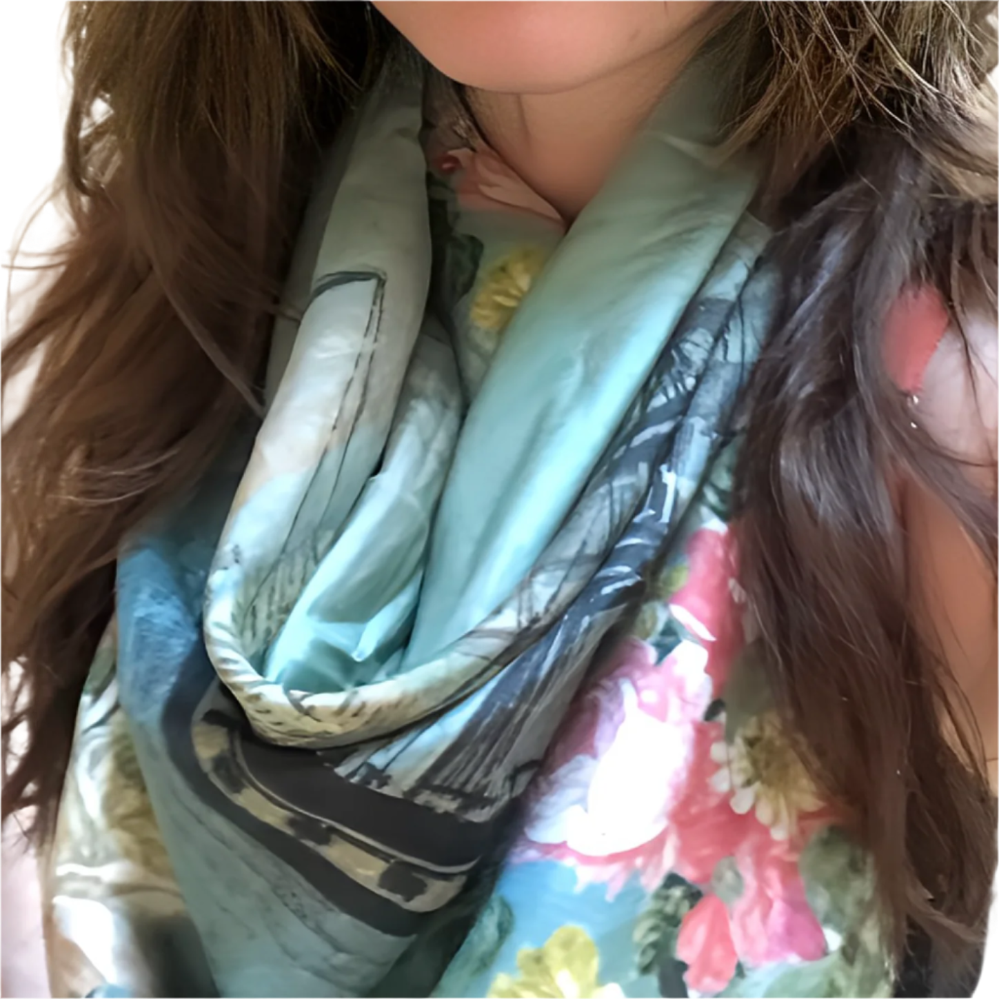 Rose di Capri women’s scarf combines the pastel colours of the sea with white, pale pink and yellow roses. This is a By M. Wear special item designed by Maria Marigliano Caracciolo. Her scarves collection is inspired by paintings and frescoes from the 19th century Neapolitan school. All scarves are made of 100% Italian silk from Como and handsewn with rolled hems.