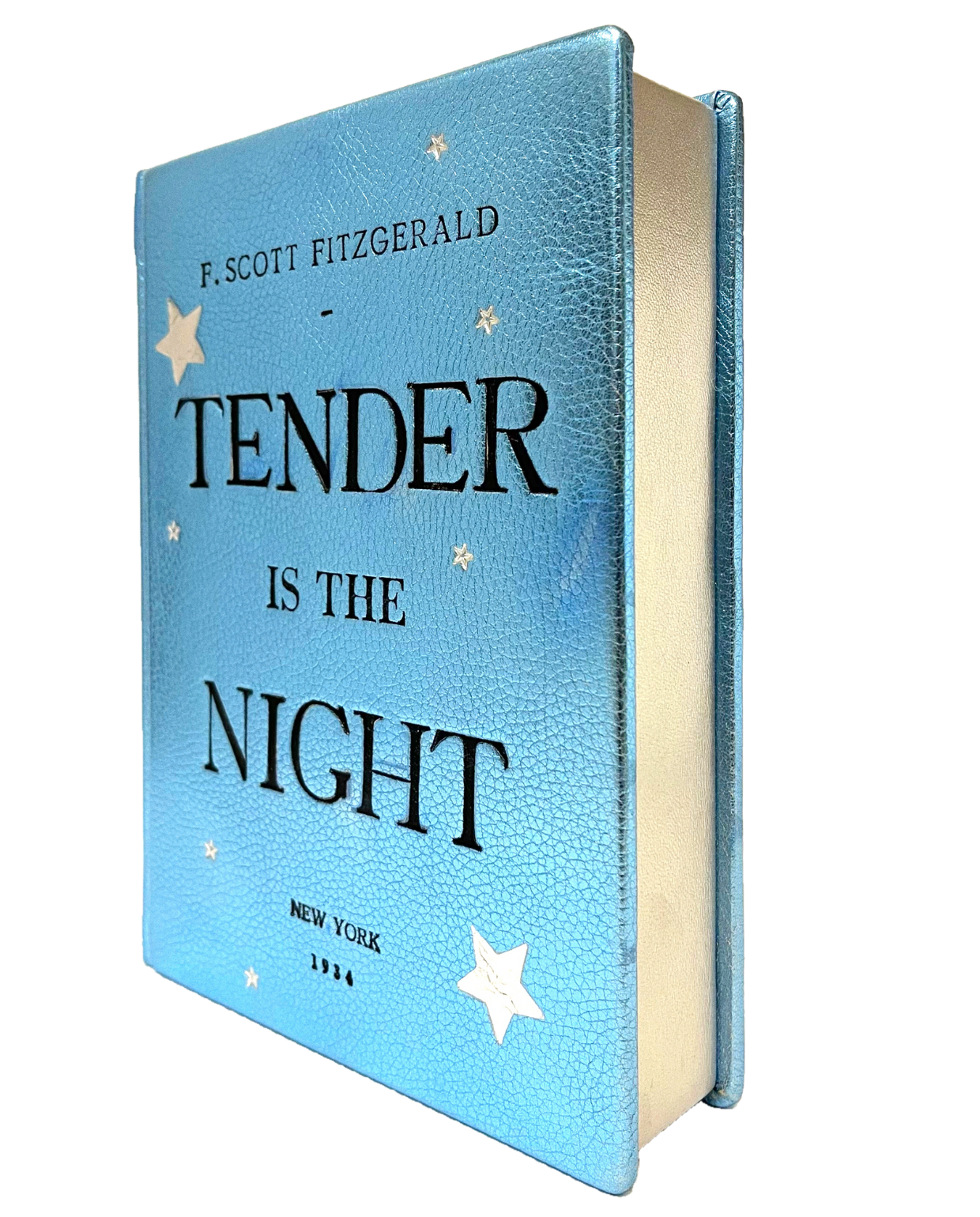 The legendary F. Scott Fitzgerald novel “Tender Is the Night” has been turned by Maria Marigliano Caracciolo into a treasured Book Clutch Bag. Entirely handmade in the finest Italian bookbindery , the luxurious hardcover is bound with a magnificent rare metallic blue leather that sparkles in the light. The hand embossing has been exquisitely done in two colours, black for the title and silver for the stars. These elegant details are proof of the hand nature of the product. Personalise it with your name or initials.