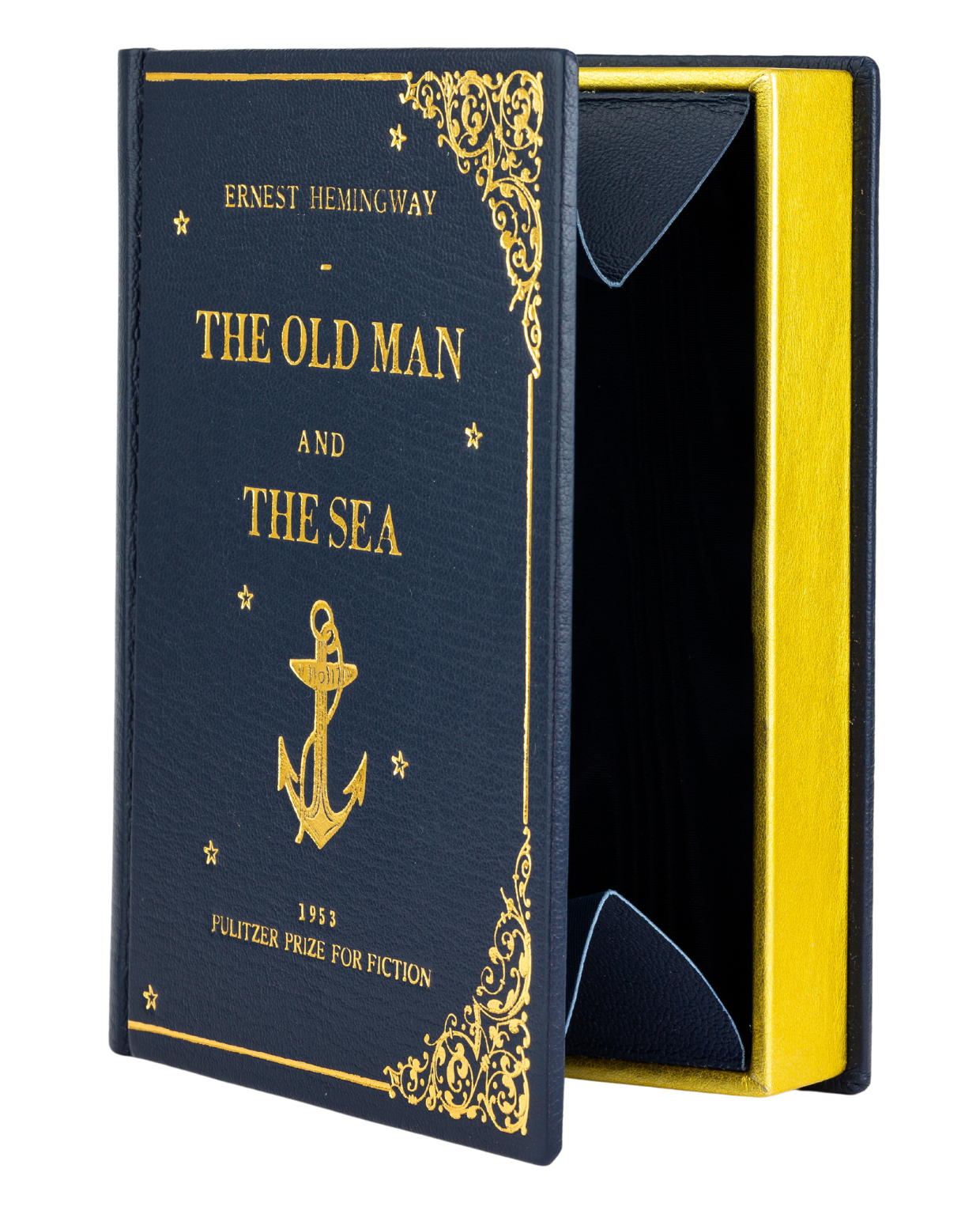 The extraordinary story of The Old Man and The Sea is now a powerful By M. book-clutch-bag for any ocean lover. Our clutches are entirely handmade in the finest Italian bookbindery just like sumptuous books belonging to a refined library. Hemingway’s Pulitzer prize as a captivating eye catching clutch in navy blue leather is a statement accessory for the most academic crowd.