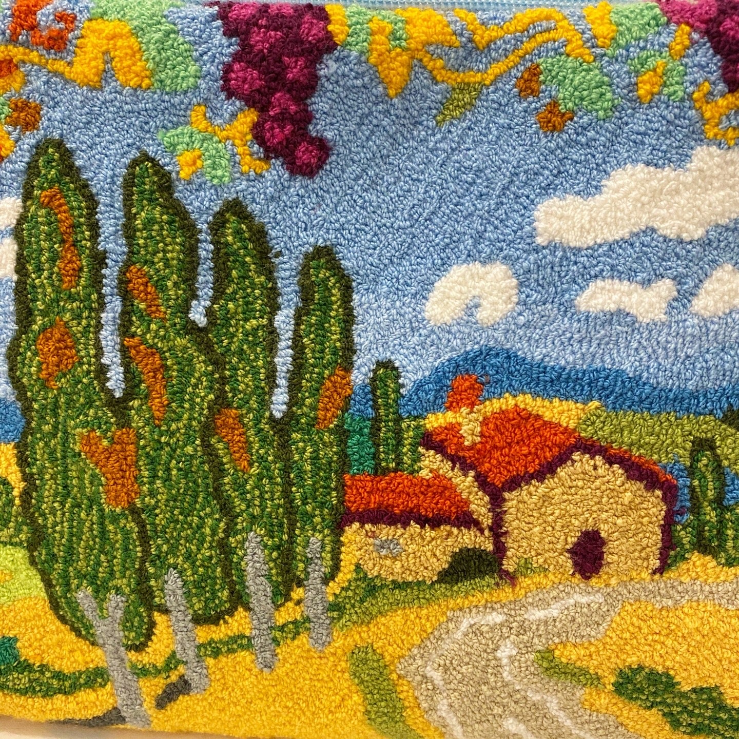 TUSCANY Clutch is a true textile work of art. The unique Tuscany countryside landscape, with its cypress trees and grapes, is handwoven on a loom to recreate this fabulous intricate design on both sides. By M. Design has selected the best female artisans for this project. We have used an ancient crochet tapestry technique passed down the generations. Each bag is completely unique. Bring it on holidays with you! Pack it flat or fold it, they are brilliant to save space! We Love the big joyous Pom Pom with the Tassel.
